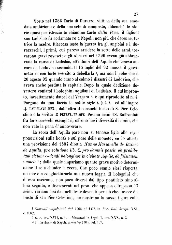 Morto nel 1586 Carlo di Durazzo, vittima della sua smodala ambizione e della sua sete di conquiste, abbenchè le storie quasi per islrazio lo chiamino Carlo della Pace, il figliuol suo Ladislao fu acclamalo re a Napoli, non più che decenne, lu-trice la madre. Riaccesa loslo la guerra fra gli angioini e i du-razzeschi, i primi, cui pareva arridere la sorte delle armi, toccarono gravi rovesci; e gli Abruzzi nel 1590 avean già abbracciata la causa di Ladislao, all'infuori dell' Aquila che teneva ancora da Lodovico secondo. IH 5 luglio del 92 mosse il giovinetto re con forte esercito a debellarla d, ma non 1' ebbe che il 20 agosto 95 quando erano al colmo i disastri di Lodovico, che aveva anche perduta la capitale. Dopo la quale dedizione dovettero coniarsi i bolognini aquilani di Ladislao, il cui impronto, inesattamente datoci dal Vcrgara -, è qui riprodotto al n. 4. Porgono da una faccia le solile sigle A.Q.L.A. ed ali'ingiro -f LADISLAVS.REX.; dall' altra il consueto busto di S. Pier Celestino e la scrilla .S.PETRVS.PP.9FE. Pesano acini 18. Raffronlati fra loro parecchi esemplari, offrono lievi diversità di conio, che non vale la pena d' annoverare.