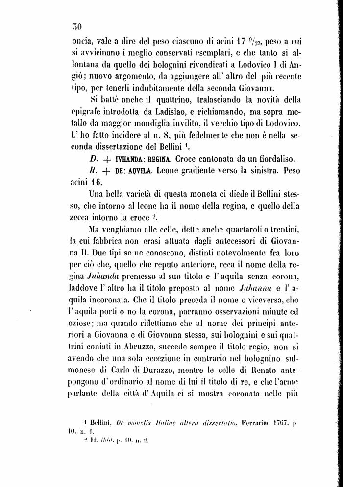 Ma vanghiamo alle celle, delle anche quarlaroli o Irenlini, la cui fabbrica non erasi alluala dagli anlecessori di Giovanna II. Due lipi se ne conoscono, disunii nolevolmenle fra loro per ciò che, quello che repulo anteriore, reca il nome della regina Juhanda premesso al suo lilolo e 1' aquila senza corona, laddove 1' altro ha il lilolo preposto al nome Juhanna e 1' a-quila incoronala. Che il lilolo preceda il nome o viceversa, che 1' aquila porti o no la corona, parranno osservazioni minute ed oziose; ma quando riflettiamo che al nome dei principi anteriori a Giovanna e di Giovanna stessa, sui bolognini e sui quattrini coniati in Abruzzo, succede sempre il lilolo regio, non si avendo che una sola eccezione in contrario nel bolognino sul-moncse di Carlo di Durazzo, mentre le celle di Renato antepongono d'ordinario al nome di lui il titolo di re, e che l'armo parlante della citlà d' Aquila ci si mostra coronata nelle più