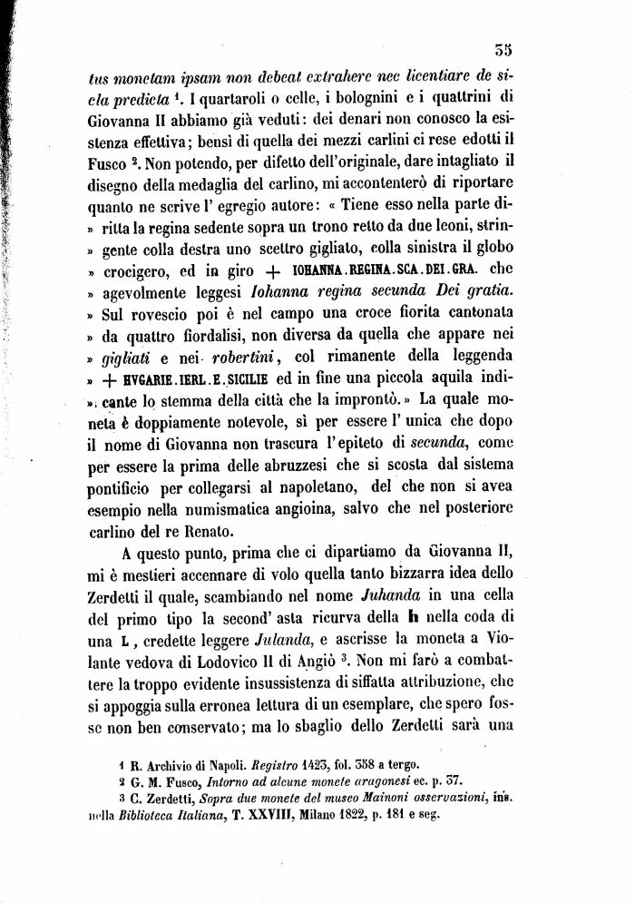 A questo punto, prima che ci diparliamo da Giovanna II, mi è mestieri accennare di volo quella tanlo bizzarra idea dello Zerdelli il quale, scambiando nel nome Juhanda in una cella del primo tipo la second' asta ricurva della h nella coda di una L , credette leggere Julanda, e ascrisse la moneta a Violante vedova di Lodovico II di Angiò 3. Non mi farò a combattere la troppo evidente insussistenza di siffatta attribuzione, che si appoggia sulla erronea lettura di un esemplare, che spero fosse non ben conservato ; ma lo sbaglio dello Zerdelti sarà una